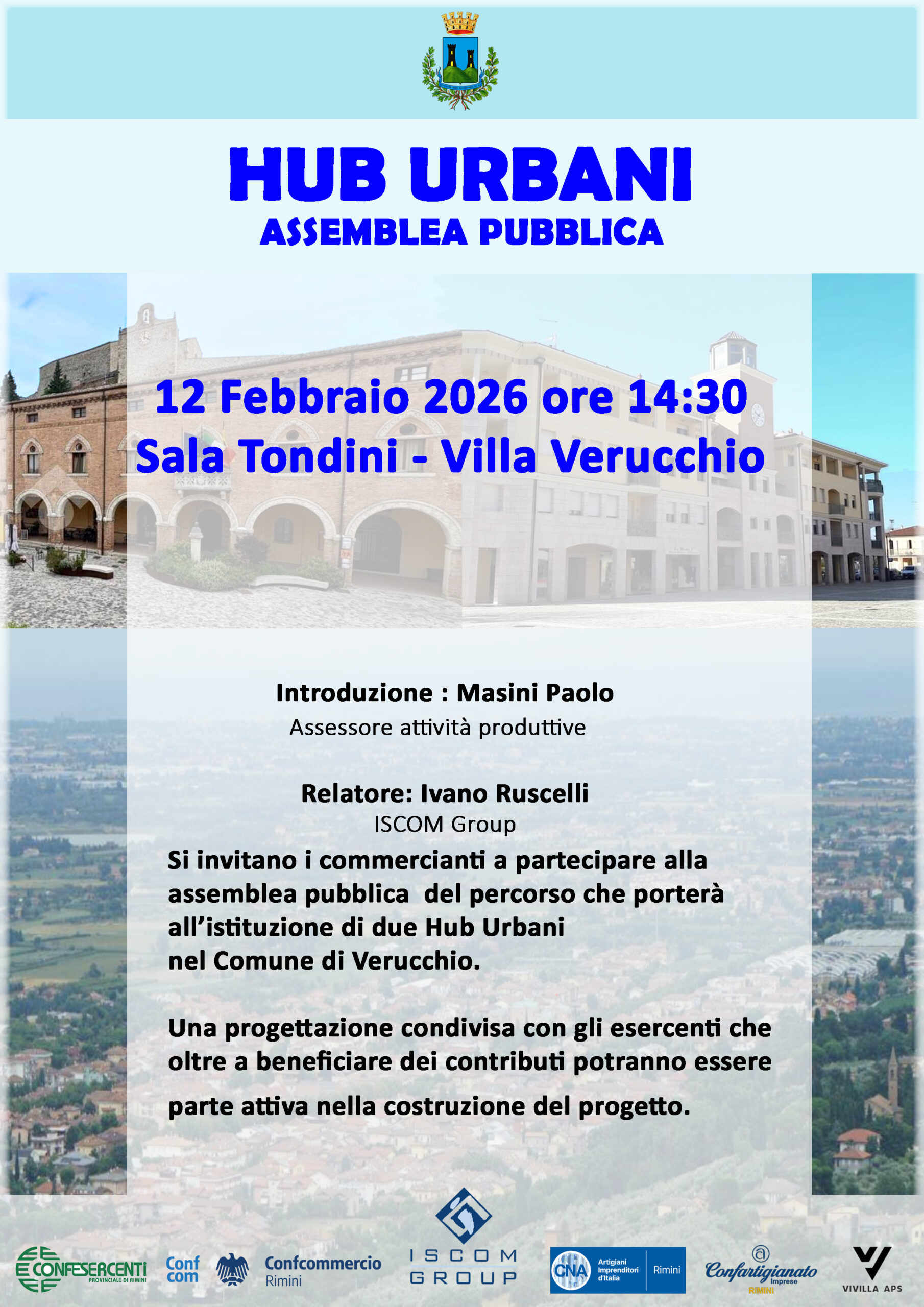 Dopo l’introduzione di Paolo Masini, vice Sindaco e Assessore alle Attività produttive del Comune di Verucchio, il progetto degli Hub Urbani sarà illustrato nei dettagli da Ivano Ruscelli di ISCOM Group.